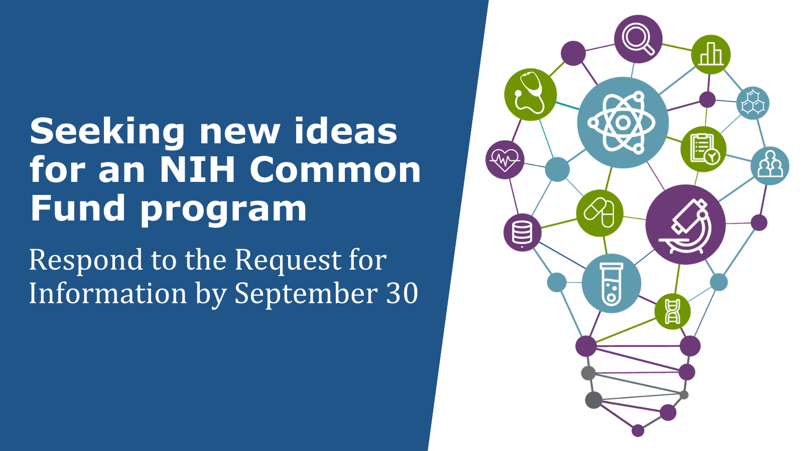 Hi CFDE team, NIH Common Fund is seeking new program ideas for FY2025 and beyond. Anyone can submit an idea in response to this Request for Information that was recently published. We would like to share this information as broadly as possible. Can we send out an email to the CFDE listserv next week (draft email attached) and Tweet about it? Please find the following resources below (and attached): |