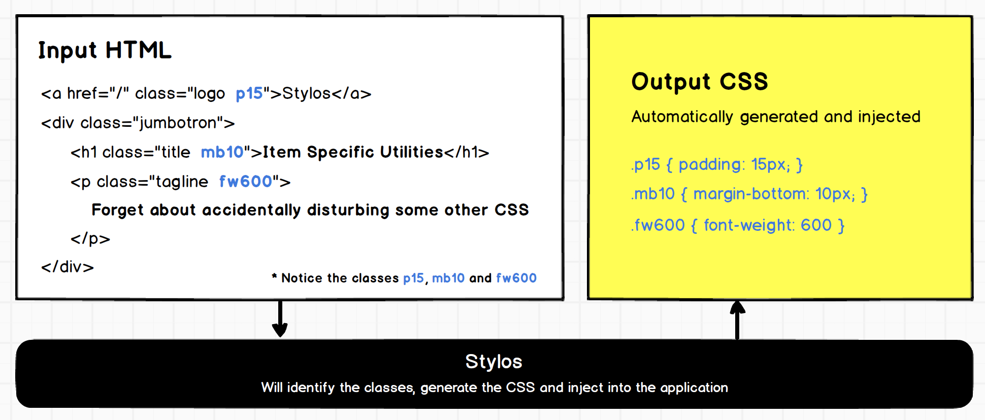 Stylos is a Webpack plugin that automatically generates and injects CSS utilities into your application. All you have to do is specify utility classes on DOM elements; webpack will identify and generate the properties with relevant values and inject them to your application.