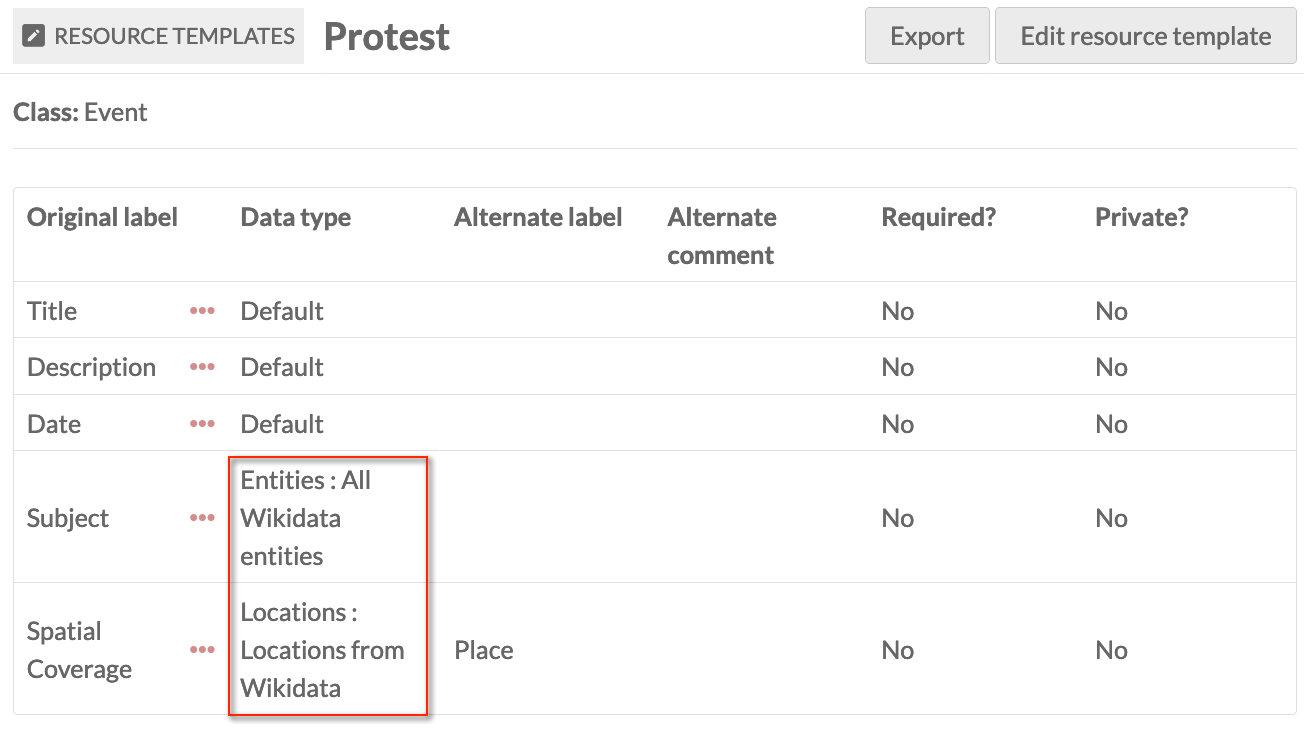When you click the Resource Template title to see its details, the Wikidata suggestion type will appear under the Data Type table heading.