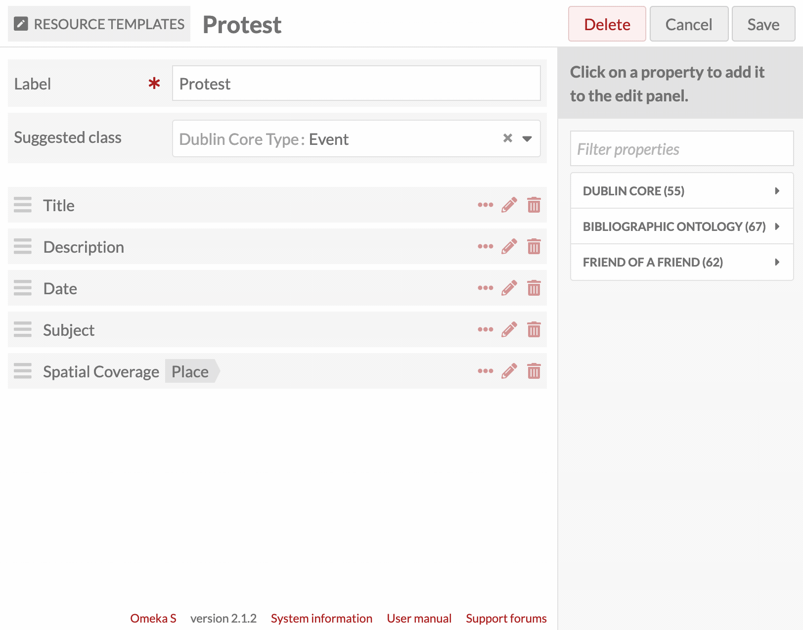 When this Resource Template is used in an Item or Item Set, the designated properties will auto-suggest values from the type of Wikidta item specified in the template.