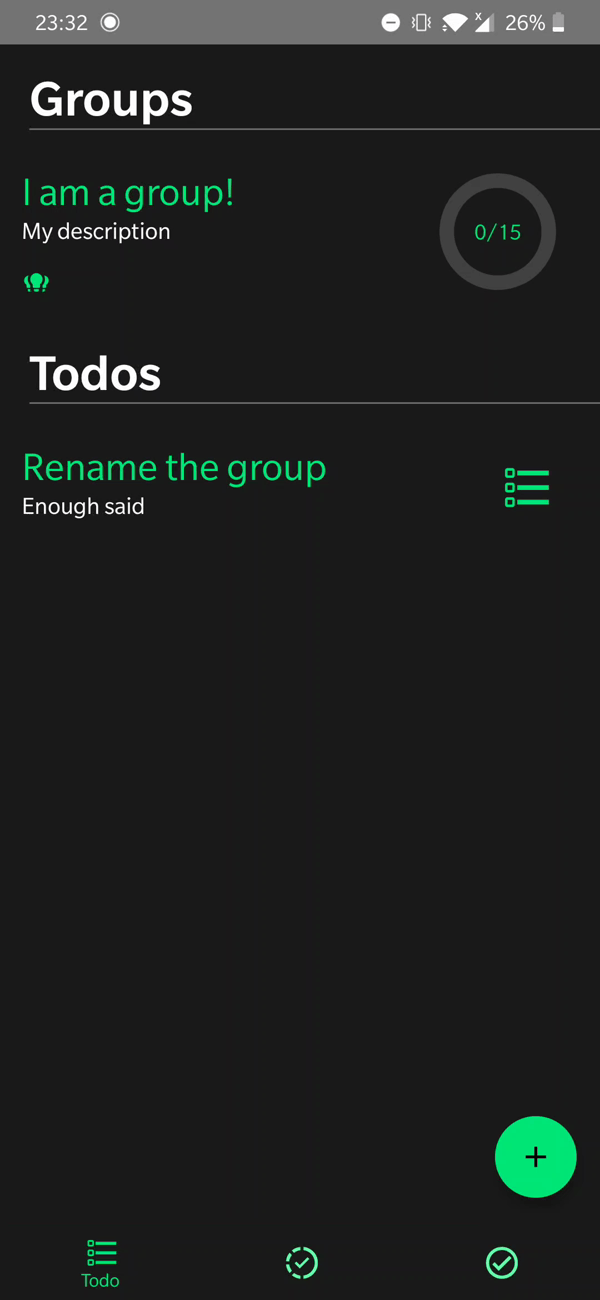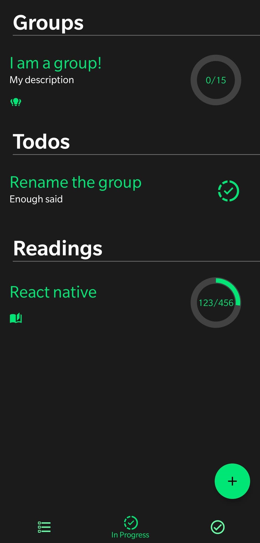 A kanban style productivity app where you can create and track individual tasks across three coloums, from Todo to Completed. Tasks can also be grouped into collections weighted by point value. Tracking book readings by pages is also possible. The FAB (Floating Action Button) allows the user to create their desired task type while the swipeable functionality of each list item allows the user to edit, delete or progress on the task.