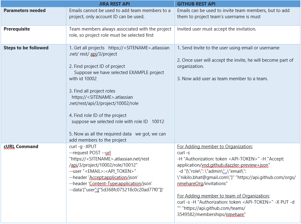 - Used the following documentations JIRA REST API and GitHub REST API as a base. The examples are given using different technologies including cURL, Node.js, Java, Python, PHP.