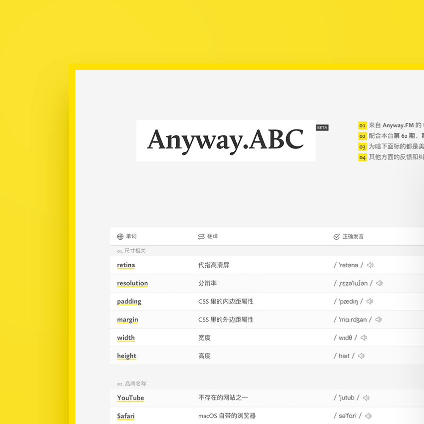 来自 Anyway.FM 的界面设计行业英文术语小词典,配合本台第 62 期节目服用效果更佳。什么?你问我为啥下面标的都是美音的音标「我……乐……意……」。对于内容其他方面的反馈和纠错可直接邮件我们。