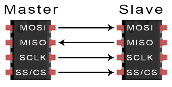 Devices communicating via SPI are in a master-slave relationship. The master is the controlling device (usually a microcontroller), while the slave (usually a sensor, display, or memory chip) takes instruction from the master. The simplest configuration of SPI is a single master, single slave system, but one master can control more than one slave (more on this below).