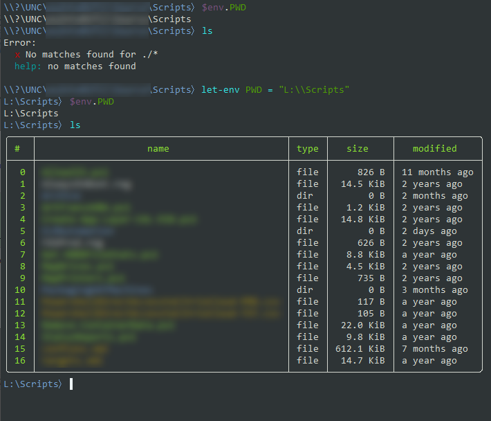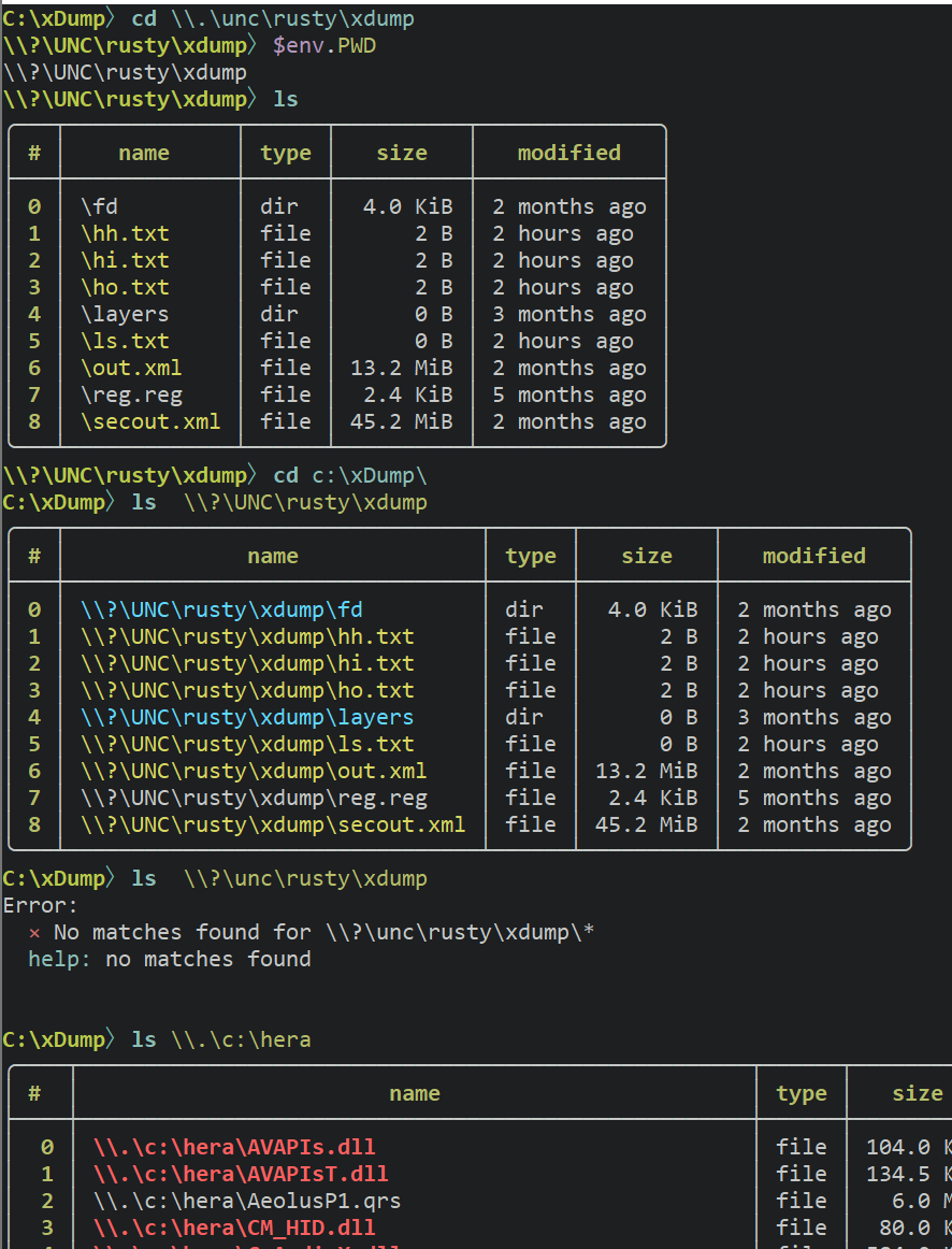 After removing the condition and using a verbatim path, nu ls does generate a contents list but not as expected. When change directory uses a verbatim path some auto correction takes place where needed (device to unc and case for example). When ls is used directly against a verbatim, there is no autocorrection, however it does generate a list. However verbatim paths currently do no just display the files but some of the path, so I assume the 'name' object is incorrect for use in piped commands. Not sure of the QA benchmarks for changes, but I would argue its better to promote adoption in the Windows (Enterprise) space with this limitation / rough edge. Unless of course more is broken... |