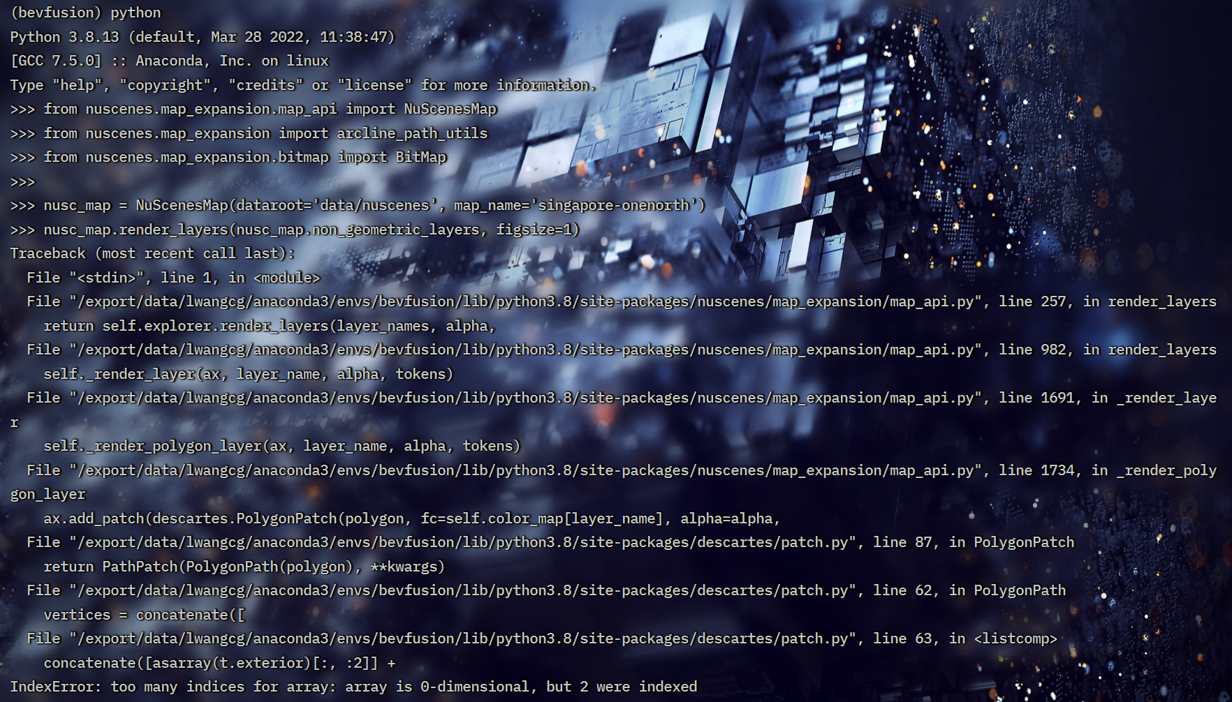 Hello, I follow the [tutorial](https://www.nuscenes.org/tutorials/map_expansion_tutorial.html) to load the map expansion. The code I use is: <img width="882" alt="image" src="https://user-images.githubusercontent.com/48406286/214310840-4c90235e-1a00-45e1-968c-ee3a3531e1b0.png"> Then the error occurs. Here I provide more details about the processed object: <img width="899" alt="image" src="https://user-images.githubusercontent.com/48406286/214310278-40a56db5-2bbe-4b2c-ac48-6911554cc356.png">