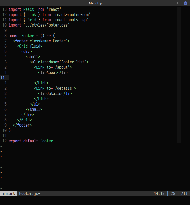 I was going to open a separate issue, but piggybacking here since this is my issue. Treesitter JSX indentation is a work in progress. With TS indentation enabled, opening a new line (indentation should be directly under the Then opening up a curly brace is really weird, goes all the way to the first column: If I disable TS indentation but still have Treesitter for highlighting, I get these incorrect results (first open newline then add in curly brace): If I use Polyglot instead, and disable Treesitter, the indentation works correctly: I tried @kyazdani42 If testing needed in future, I would be happy to help. Cheers. |
