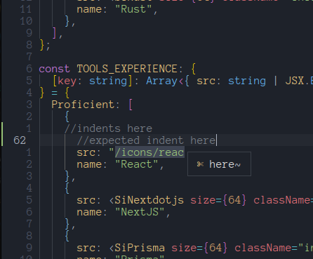 I've just made the transition from Polyglot to Treesitter, and can confirm that I'm running into at least some variation of this problem. I can recreate indentation problems with a minimum setup of only treesitter, confirming that I do have the Creating a new line from within a function specified outside the This problem seems to be exacerbated once plugins are added that take into account the ESLint file etc, and the new line indentation is way off. In summary, I'm seeing the same as sahibalejandro for the conditional statements, but it's slightly different for the other scenarios they've specified. Changing the file type doesn't seem to make any changes for me. I'm using Nvim 0.7 with the latest treesitter version. |