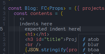 However, tags within tags are still wonky. Apologies for stating all was working well. I do very little JSX so my test was very quick, too quick. Request indent settings are: