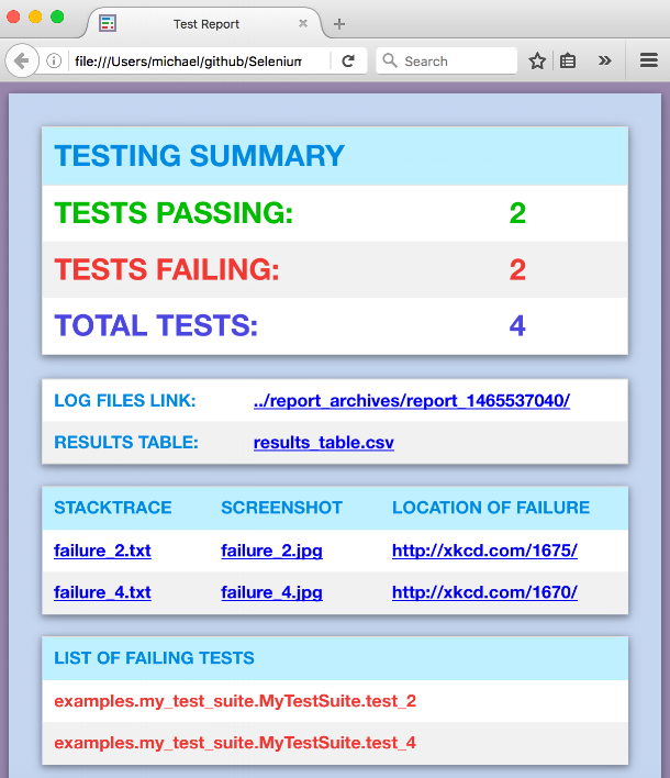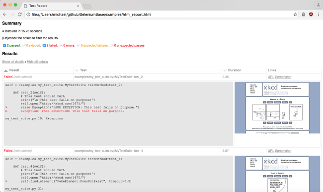 SeleniumBase automatically handles common WebDriver actions such as spinning up web browsers and saving screenshots during test failures. (Read more about customizing test runs.)