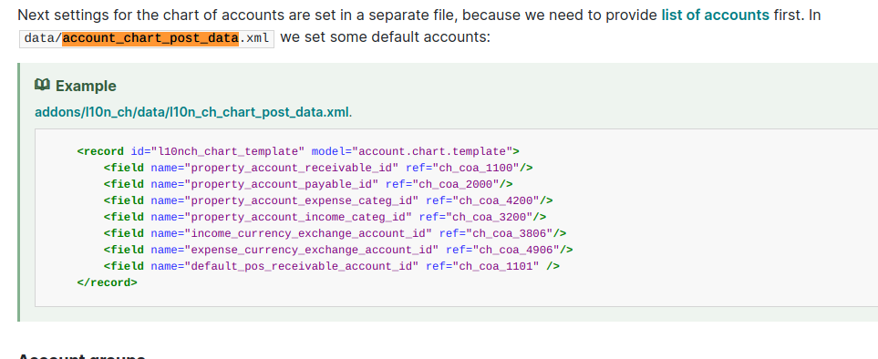 | Next settings for the chart of accounts are set in a separate file, because we need to provide `list of accounts <#accounts>`__ first. In `data/account_chart_post_data.xml` we set some default accounts: | ||