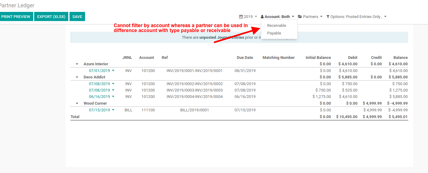 same remark for the 2 Aged partner reports. We need a filter and a group by account. At the moment there no filter at all !