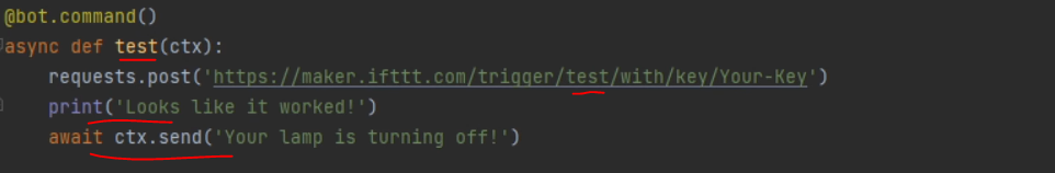 To add more commands, you can copy and paste the command part in the code. Then, make a new applet in IFTTT. Change the following: Command name, IFTTT event name in URL, and the print and ctx.send messages.