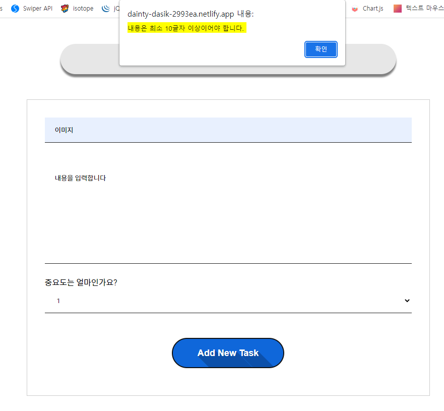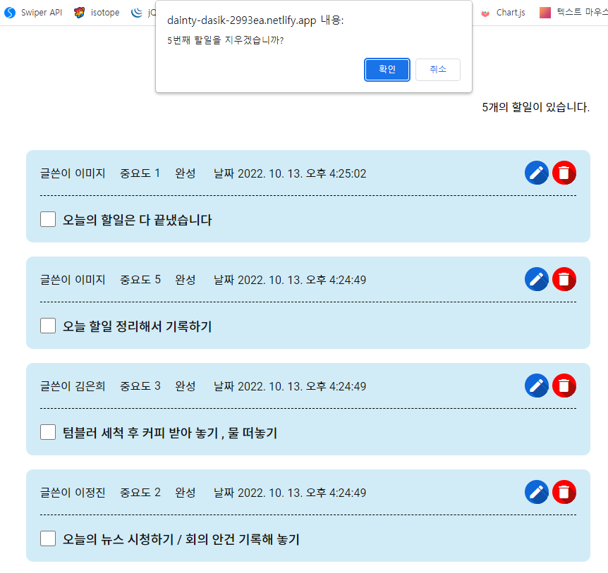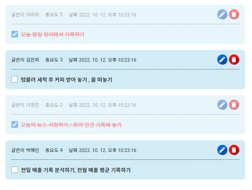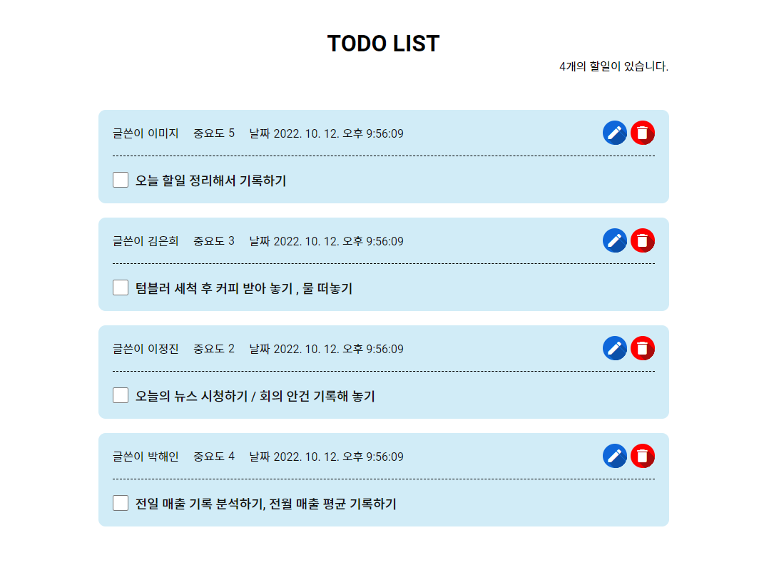 오늘 해야할 일의 추가, 수정, 체크, 삭제 기능이 가능한 Todo List 페이지입니다.