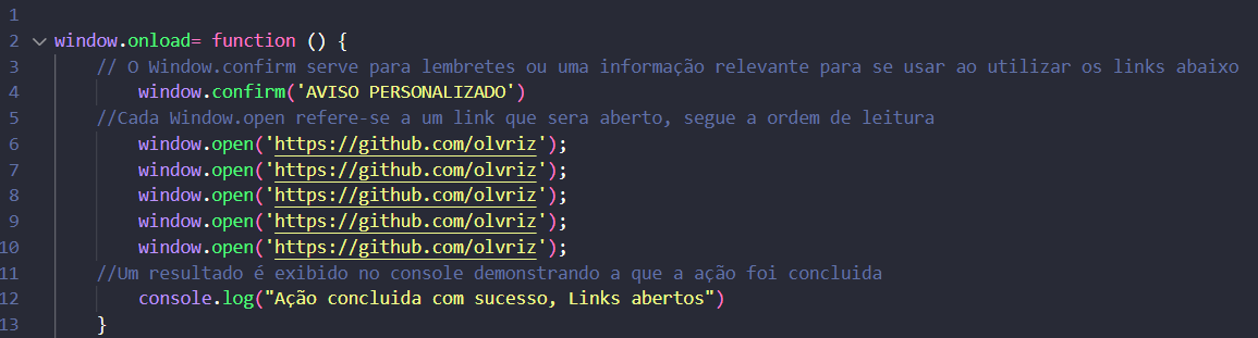 - Essas linhas em JavaScript são responsaveis por abrir os links, Os mesmos serão abertos ao mesmo tempo, respeitando a ordem de leitura (de cima para baixo).