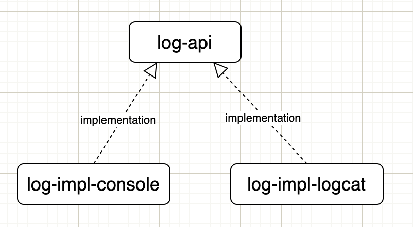在使用时,我们需要依赖一个 log-api 模块和仅一个实现模块(比如 log-impl-console)。然后在打日志时,我们是不关心具体实现的,所使用的类都是在 log-api 模块的。