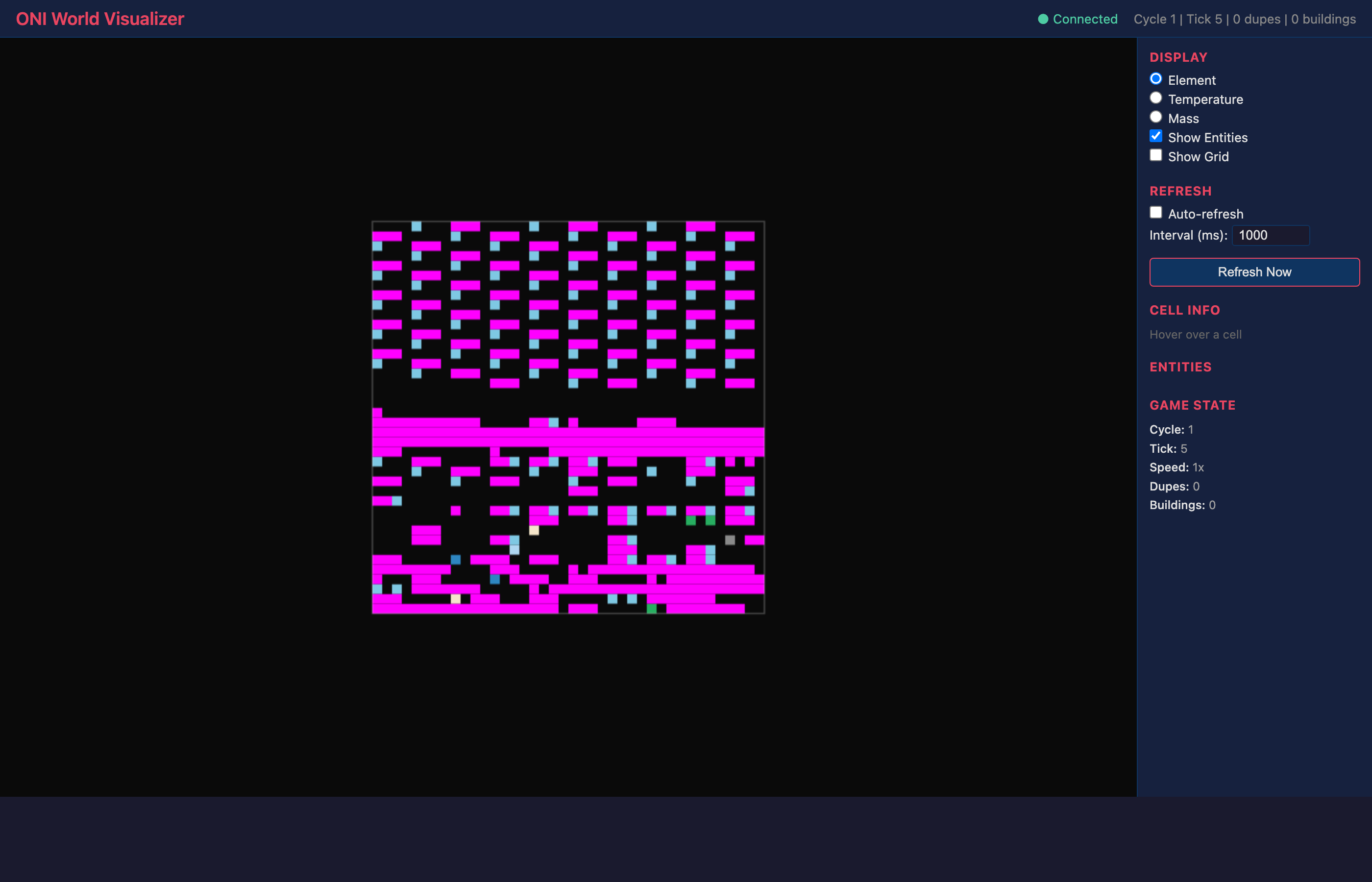 src/DedicatedServer/)WebServer.cs— lightweight HTTP server (HttpListener, port 8080)wwwroot//api/health,/api/world,/api/entities,/api/state,/api/elementsMockWorldState.cs— generates fake 64x64 ONI world with elements, temperature, massProgram.cs— console entry point with assembly resolution for game DLLsWeb Client (