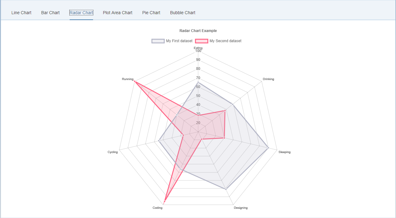 | datasets | Object | null | Data to be displayed by the Chart. Data structure will change based on the current Chart type. |