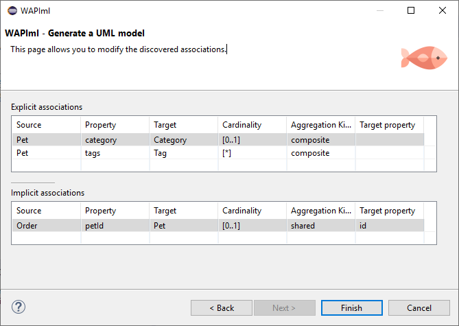 - The first table includes the explicit associations defined using JSON Schema (properties of type object or array of objects). You could change the aggregation kind of an association by clicking on its row (the default one is composite).