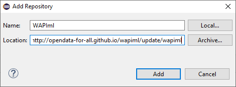 - Click on Add... and fill in the form as indicated (the update site is https://opendata-for-all.github.io/wapiml/update/wapiml/) then click on OK.