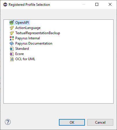 - Follow the steps in the wizard to initialize a Class diagram (keep everything as predefined except in the Initialization information step where you should check Class Diagram as the Representation kind and click on Browse Registered Profiles and select OpenAPI as shown below).