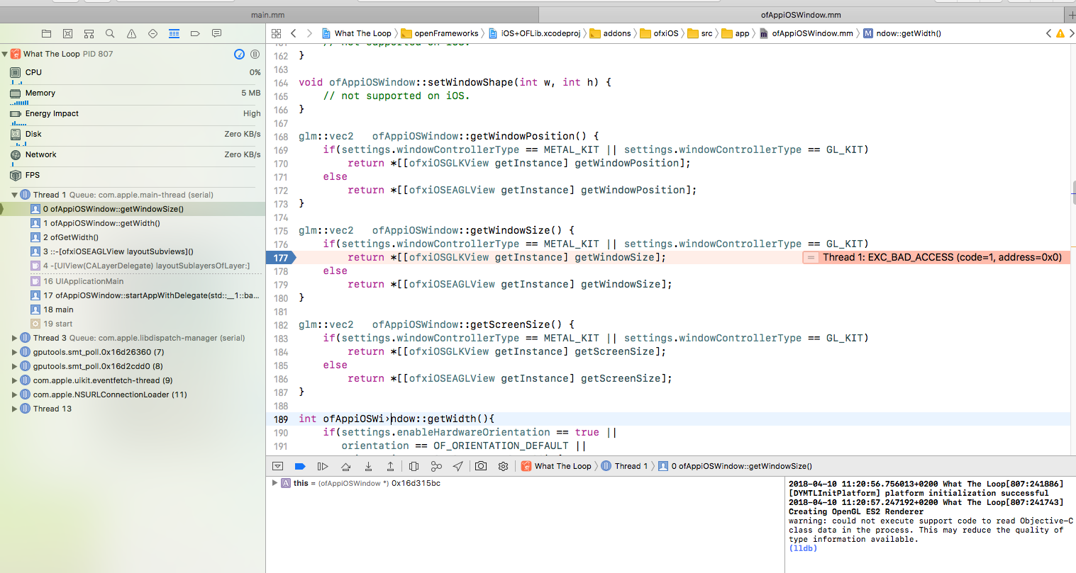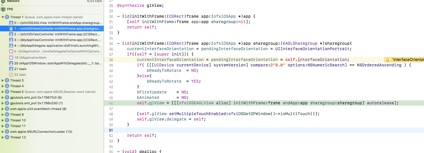 Hi @danoli3, I just tried to use the GLKit window controller with the latest master by adding this setting: However, it crashes when trying to get the window size: the instance in [ofxiOSGLKView getInstance] is actually a ofxiOSEAGLView, and therefore it crashes. I noticed that it's still creating a EAGLView, but not a GLKView: How do I correctly use the GKKit window controller in OF? Thanks! |