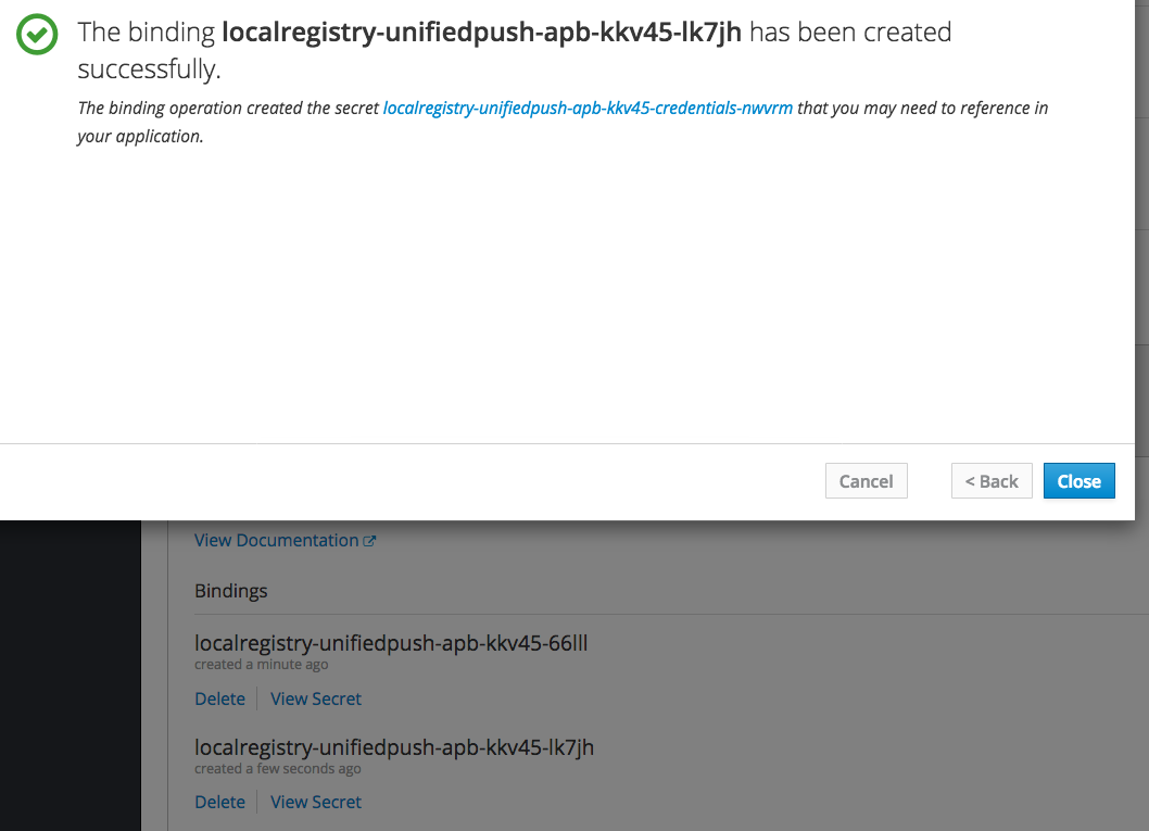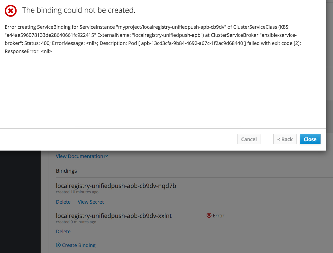msg: "bind that always fails"The log snippet shows the binding starting, running, and finally failed. This is using OpenShift 3.10 with a release-1.2 broker: |