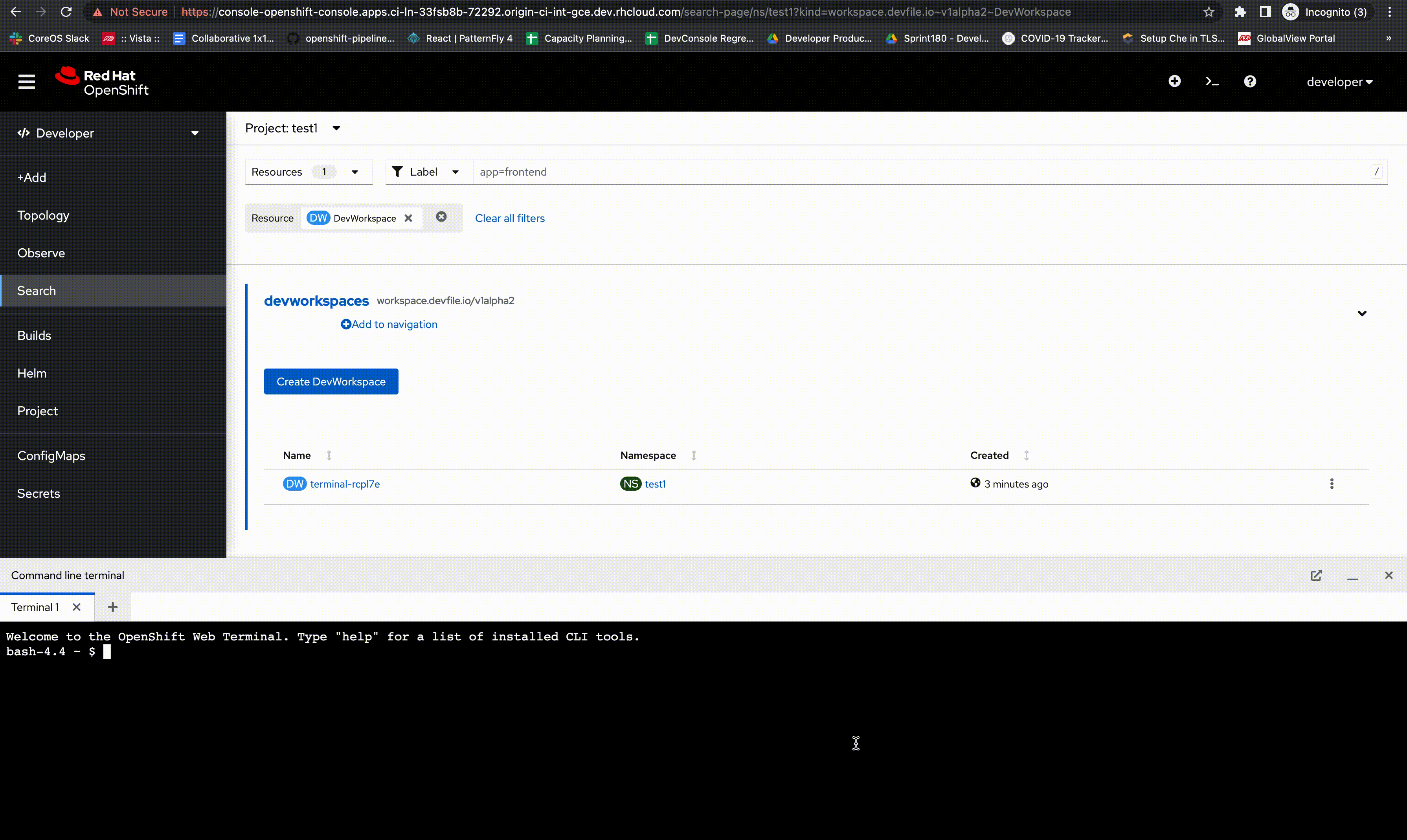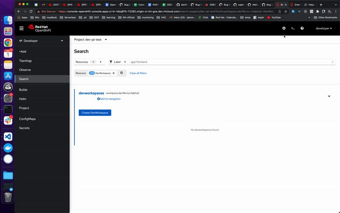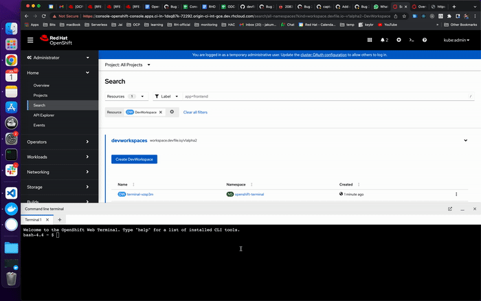 launch openshift/console#11597 gcp(if not done already)masthead terminal icon.Searchand search fordevworkspaceCR.devworkspaceresource for thenamespacewhich was used to initialise the terminal.Desired Outcome
