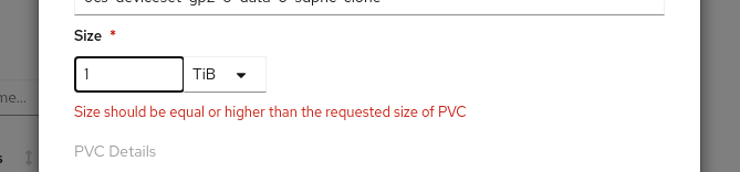 | helperTextInvalid="Size should be equal or higher than the requested size of PVC" | |