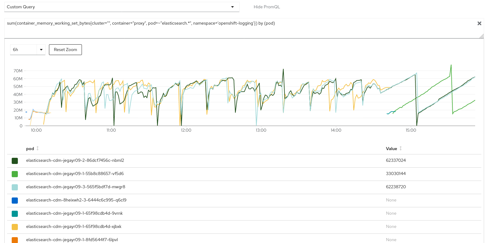 The current default memory requests and limits for elasticsearch-proxy are set to 64Mi. This is a too tight budget according to metrics (see below):