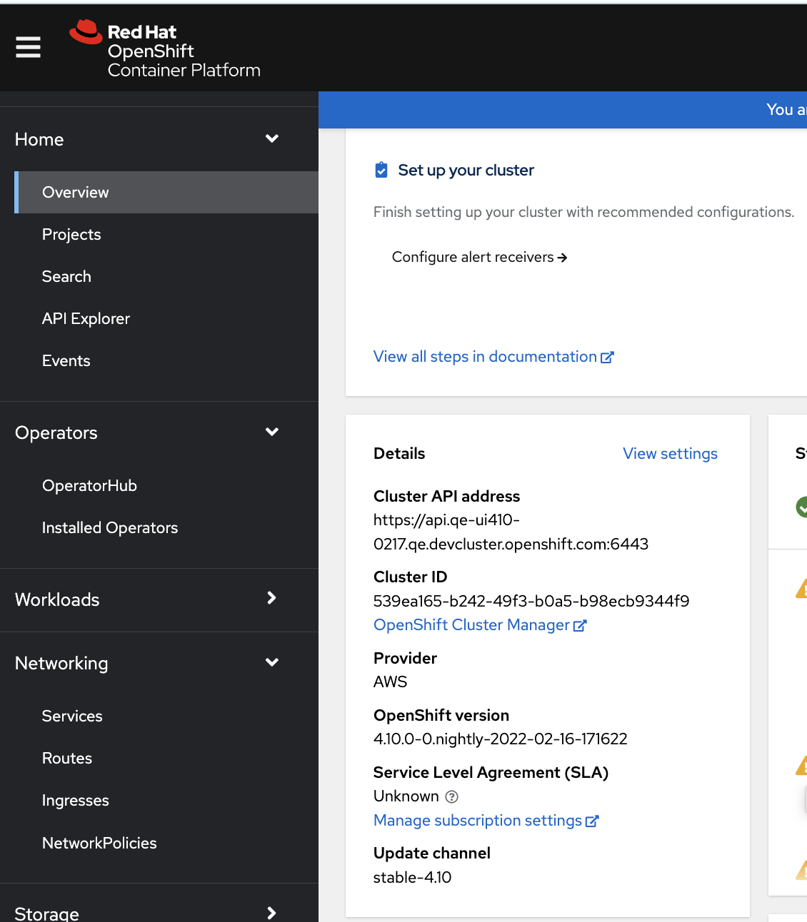"{product-title} now enables you to view support level information about your cluster. You can add a notification to your notifications drawer when the cluster is unsupported. To add a notification, navigate to Overview -> Details card in the Cluster Settings, in the About modal. From the Overview page, you can manage subscription settings under the Service Level Agreement (SLA). "