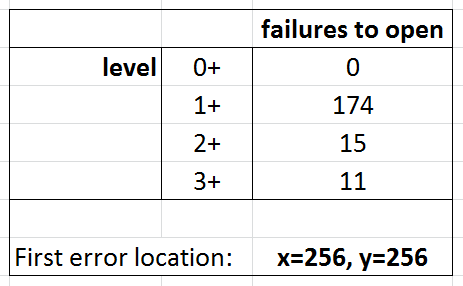 None of the files I've worked with had errors on level 0, the errors started at level 1 and beyond. All these files were imaged from 76x26mm glass slides, so it is possible there was not enough slide surface area to fail on level 0. |