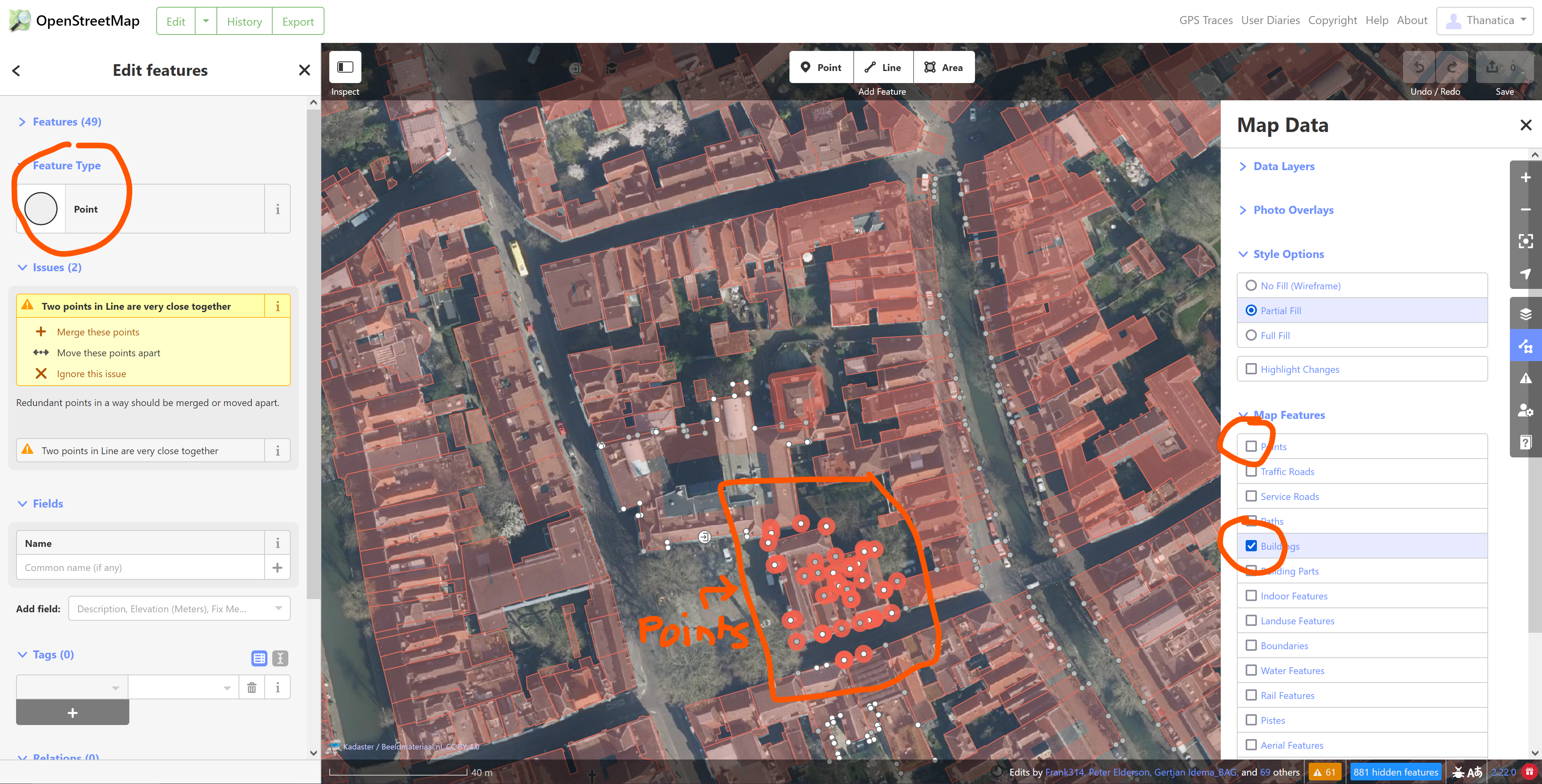 Yes it is. Just tried it seconds ago: On the left & on the map, you can see it has managed to select points. On the right, you can see I have unticked points, and only ticked the buildings checkbox. Edit: I just had a thought. On the one hand, it might be totally logical for it to do this. After all, buildings have to consist of points in order to exist on the map. But then why isn't it also selecting the buildings itself? Another thing is that if lasso-selection doesn't care about feature visibility, why isn't it also selecting streets, for example? In other words: technically this might seem perfectly sensible. In terms of user experience, one might argue that this doesn't make any sense at all, because generally a user doesn't care about technical specificities 🙂 |
