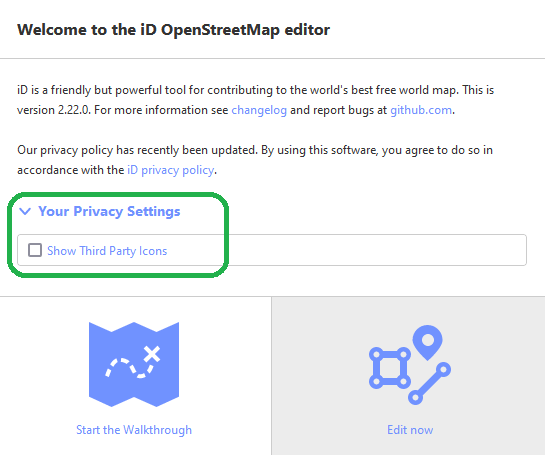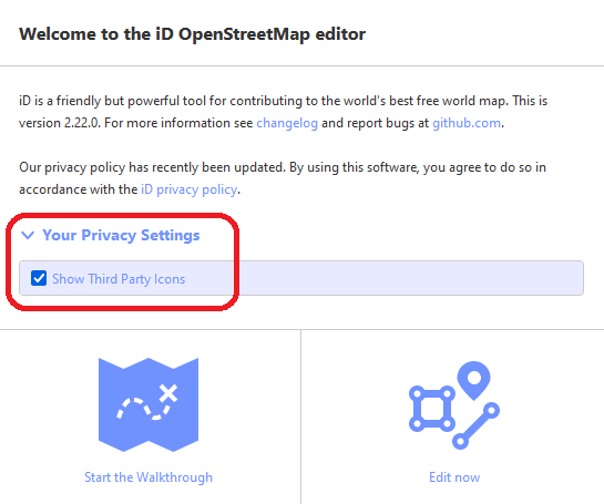 What about a third option, to show only icons from Wikimedia Commons? Though Wikimedia is still a third party, it’s present anyways via the ubiquitous ℹ️ button and dropdown suggestions for the Wikipedia and Wikidata fields, not to mention the OSM Wiki and taginfo. NSI provides Commons images for many brands, but iD either uses them as a last resort or not at all. Then again, a third option would be even more upfront complexity for someone who hasn’t even gotten to the walkthrough yet…