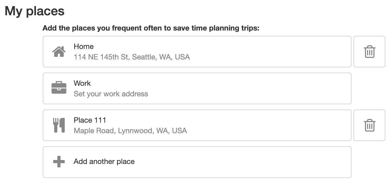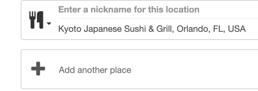 usingby updating the widget (LocationFieldfor entering locations and obtaining the locations coordinates, so that coordinates are persisted with the user preferences.FavoritePlaceRow) to display each location (place).The PR also lets the userClicking aFavoritePlaceRowopens a page (FavoritePlacePage) where the user can change the type of location (e.g. 'dining', 'custom' - what other predefined types need to be added?).A dropdown is added to the left of the location. (It is not possible to edit the nickname of each location yet.)Code-wise, each location row is now its own