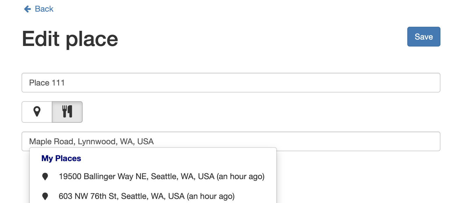 FavoriteLocationFavoritePlaceRowcomponent. TheFavoritePlacePagethathosts a styledFavoriteLocationFieldPlaceLocationFieldversion ofLocationField.This will allow further refinements of the layout or allowing more advanced editing so let me know if you have any suggestions.EDIT 1:
