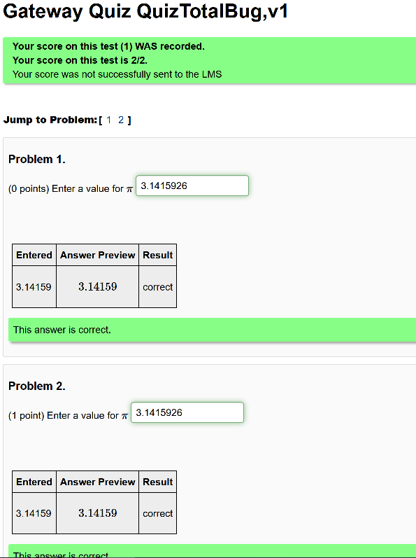 In this example, the submission screen shows "Your score on this test is 2/2" when it should be 1/1.