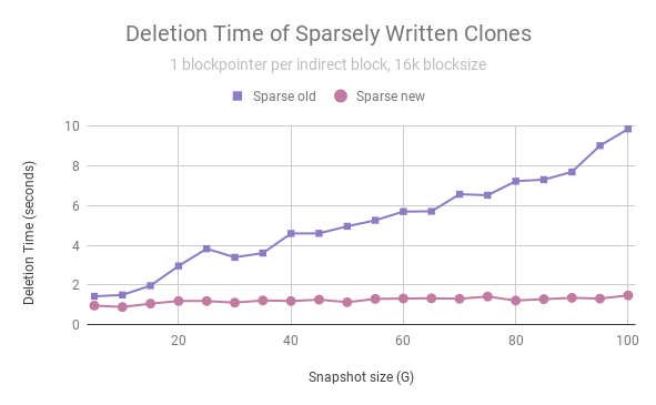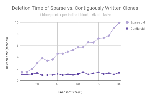 I also examined performance changes to the old algorithm's "best case" scenario - that of contiguously overwritten clones. I wasn't expecting to be a performance improvement with the livelist strategy since the old method was already very efficient (because of the way the overwritten block pointers laid out in the block tree) and we can see from the figure below that the livelist does add some overhead. However, since the deletion time is still proportional to the amount of data written and real world scenarios are likely to be a hybrid of sparse and contiguous write patterns, I'm not concerned about this performance change.