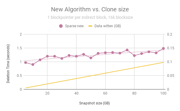 I repeated the first test discussed above for deleting sparsely written clones and found a dramatic performance improvement using the new algorithm. As the above figure shows, the old deletion time grows linearly with respect to the size of the snapshot, while the new deletion time grows at a much smaller rate. In the following figure, I compare the new deletion time to the size of the data written to the clone and we can see that it's now proportional to that.