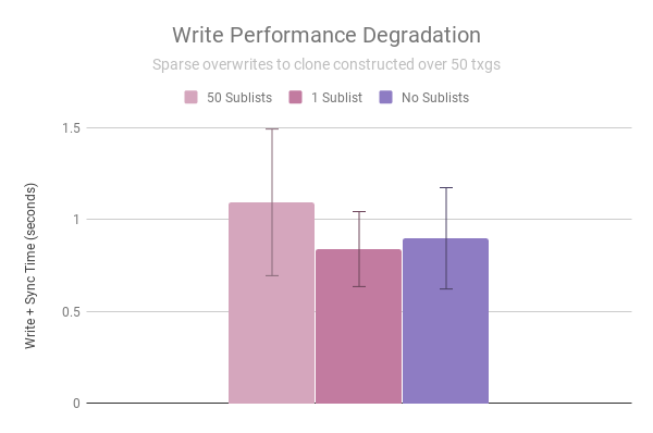N = 50,N = 1andN = 0(the old algorithm that doesn't use livelists). We can see that a larger number of sublists does result in degraded write performance. This motivates the reasoning for having the sublist size be as large as is reasonable, given memory constraints, as well as the condensing of sublists and disabling of livelists altogether once the clone has been overwritten past a certain point.Note: the figure shows the average time of 1000 writes and the standard deviation.