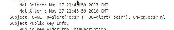 @fabianfrz it's quite unlikely that this will surface in the wild, but for sensitive information there are email addresses in place (project) that people can (and do) use. I'm not entirely sure what the issue is in the certificate details view, your screenshots doesn't appear to have any script code in it. |