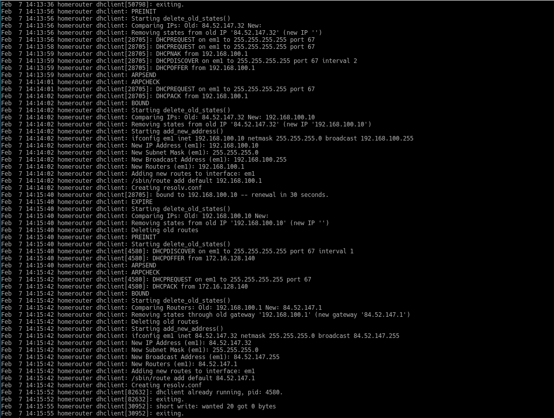 I have opnsense box connected to cable modem and is configured to get ip via DHCP. Opnsense box is connected to UPS so when power goes out only the modem powers off. When the power comes back the opnsense gets "temp" ip from modem: 192.168.100.10. But then when it should get "real" ip it chrashes returning the error atached below.