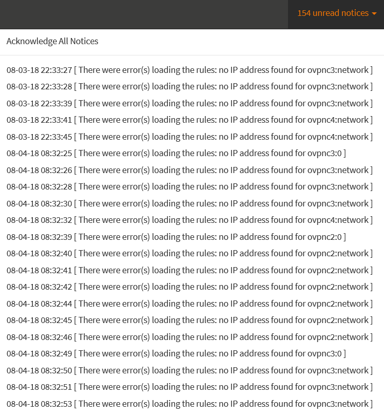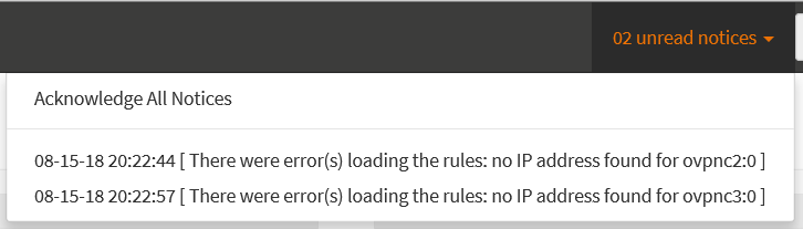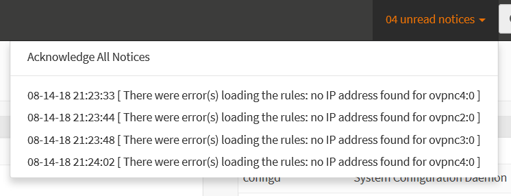 With the latest 18.7.7-18.7.8... After a while of running... in this case 4 hours of uptime. I still see two issues: "There were error(s) loading the rules: no IP address found for ovpnc2" which I need to acknowledge. Additionally and in my opinion, more importantly: OPNSense is losing the status of the OpenVPN clients and servers. They show the red down icons and lose IP addresses, but they are all really still up and active. I believe OPNSense is losing track of the status of the OpenVPN connections. I believe this issue was fixed once before in a recent past release but has since resurfaced. OpenVPN errors: However, logs show: "openvpn[46774]: Cannot open TUN/TAP dev /dev/tun2: Device busy (errno=16)"... |