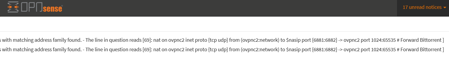 Now the underlying issue is that gateway(s/ groups) are relevant for step 3 and 5 and 6, so you have OpenVPN devices not configured but asked to be part of rules that are supposed to do network-related translations that have not yet been started in case of step 3. There may be more side-effects from slow links (PPPoE can be particularly slow in this regard to fail to provide basic connectivity in step 2 and thus to be redone in step 6 so you end up with multiple rules reloads that are not fully functional and will throw these errors. There's no priority / connectivity hierarchy in gateway groups which can make this a daunting task to get just right to "program" which link is required to be able to upgrade a gateway or for it to be used at all, let alone set up and enabled in the rules dynamically. But step by step, we have time :) |