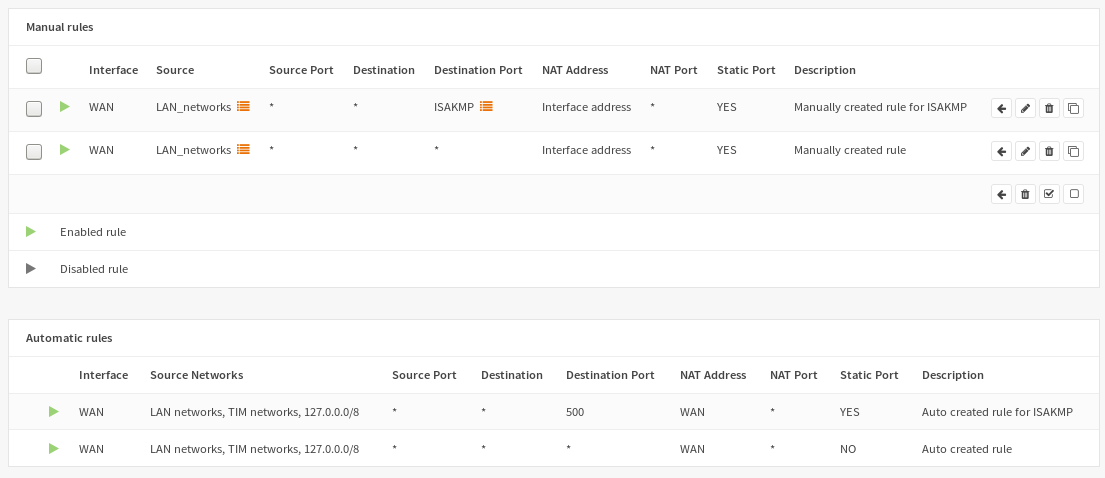 You mean WAN is incorrect as "Translation / Target" and "Interface address" is actually correct? That may very well be the case, as it seems to work fine. However, the automatic rule shows "WAN": EDIT: compare the different entries under "NAT Address". |