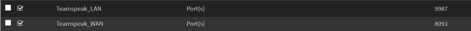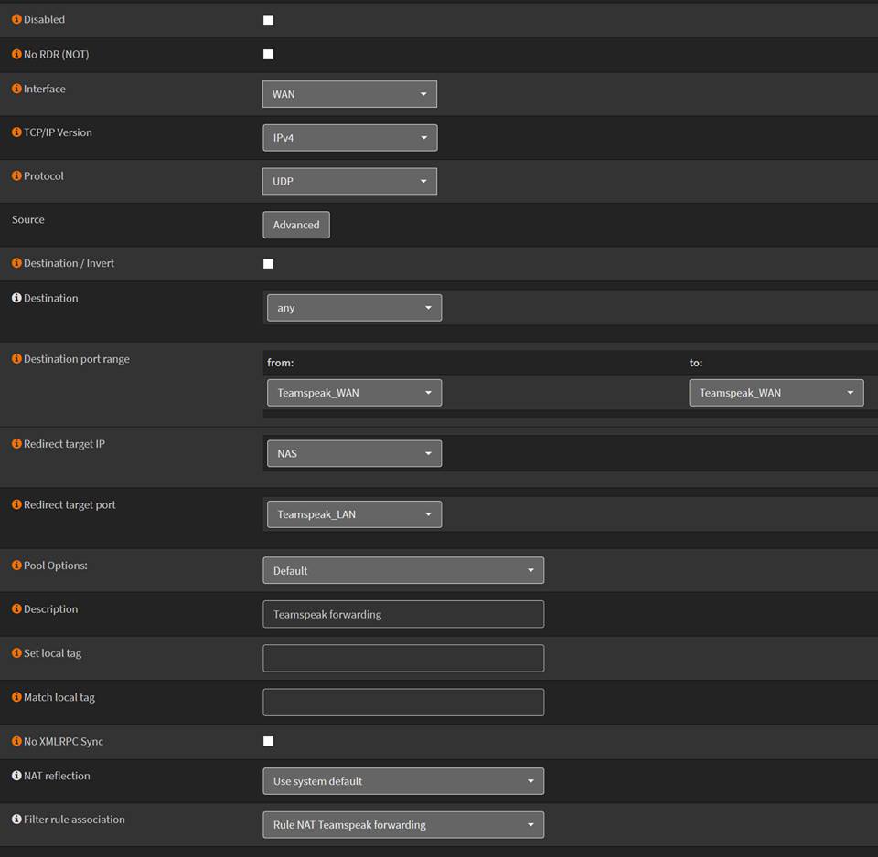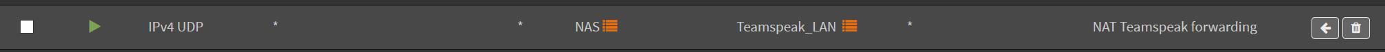 Rules debug: on igb0 inet proto udp from {any} to {any} port $Teamspeak_WAN -> $NAS # Teamspeak forwarding Some of the working NAT are: Hope it helps :-) |