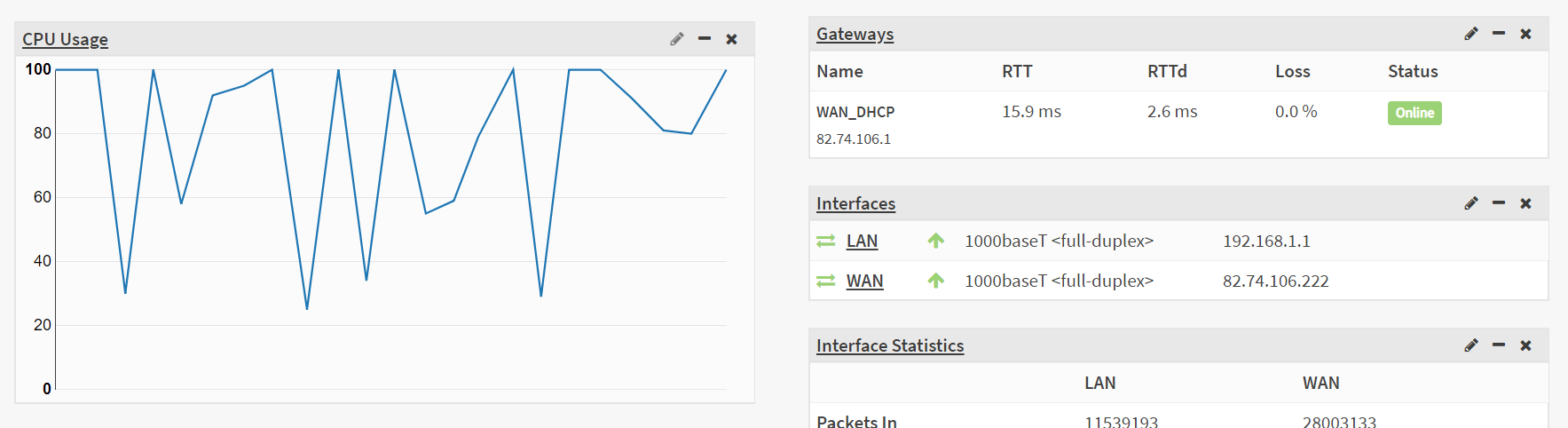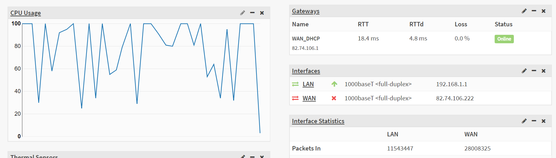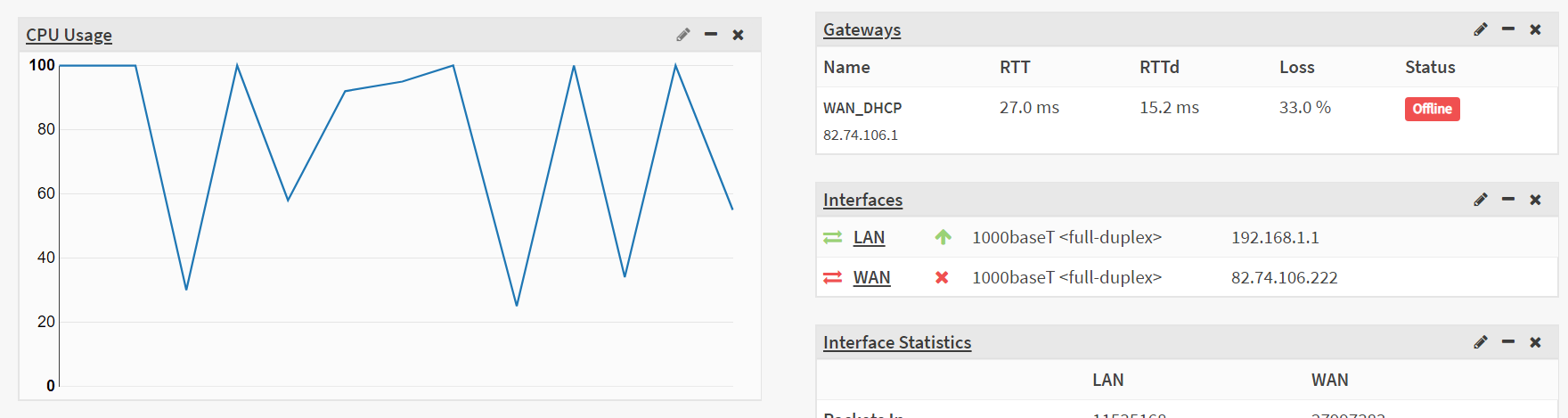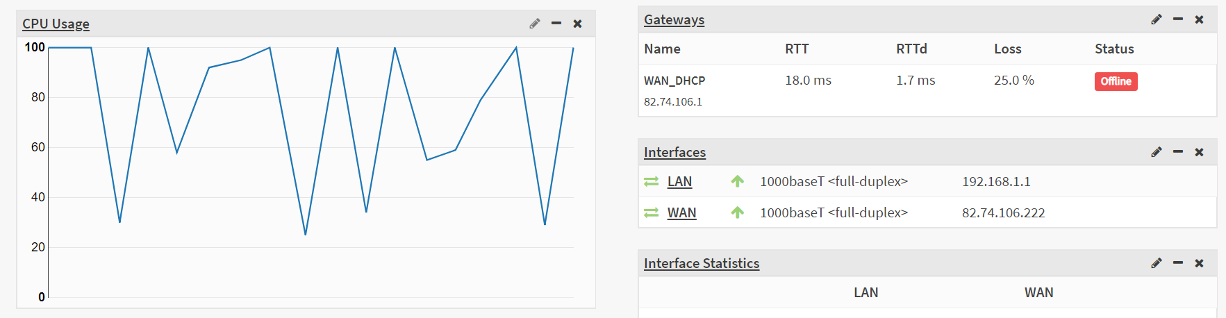 @AdSchellevis no, I didn't. The box is ticked, so I assumed that the patch is in place for 19.1.1. I only removed the text in the options modifier box. In itself this should not change a thing, as patch is applied through the tick box. Ifconfig still shows MTU of 1500, which confirms this. The system just goes into high cpu load and router advertisement deamon goes to 'red'. A reboot solves everything and cpu load goes to normal. Apparently it just has to do with updating the WAN settings in general, because changing Interfaces>Wan>General configuration>Description from "" into "test" generates the same behaviour. |