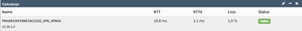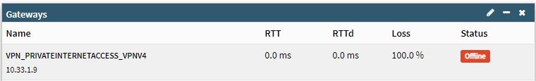 On the home screen dashboard, dpinger shows the gateway as down/offline. VPN connection is up perfectly.
