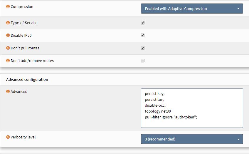 I did notice that the VPN Server tries to push these options on to OPNSense Client: openvpn[22479]: PUSH: Received control message: 'PUSH_REPLY,redirect-gateway def1,dhcp-option DNS 209.222.18.222,dhcp-option DNS 209.222.18.218,ping 10,comp-lzo no,route 10.43.1.1,topology net30,ifconfig 10.43.1.10 10.43.1.9,auth-token'