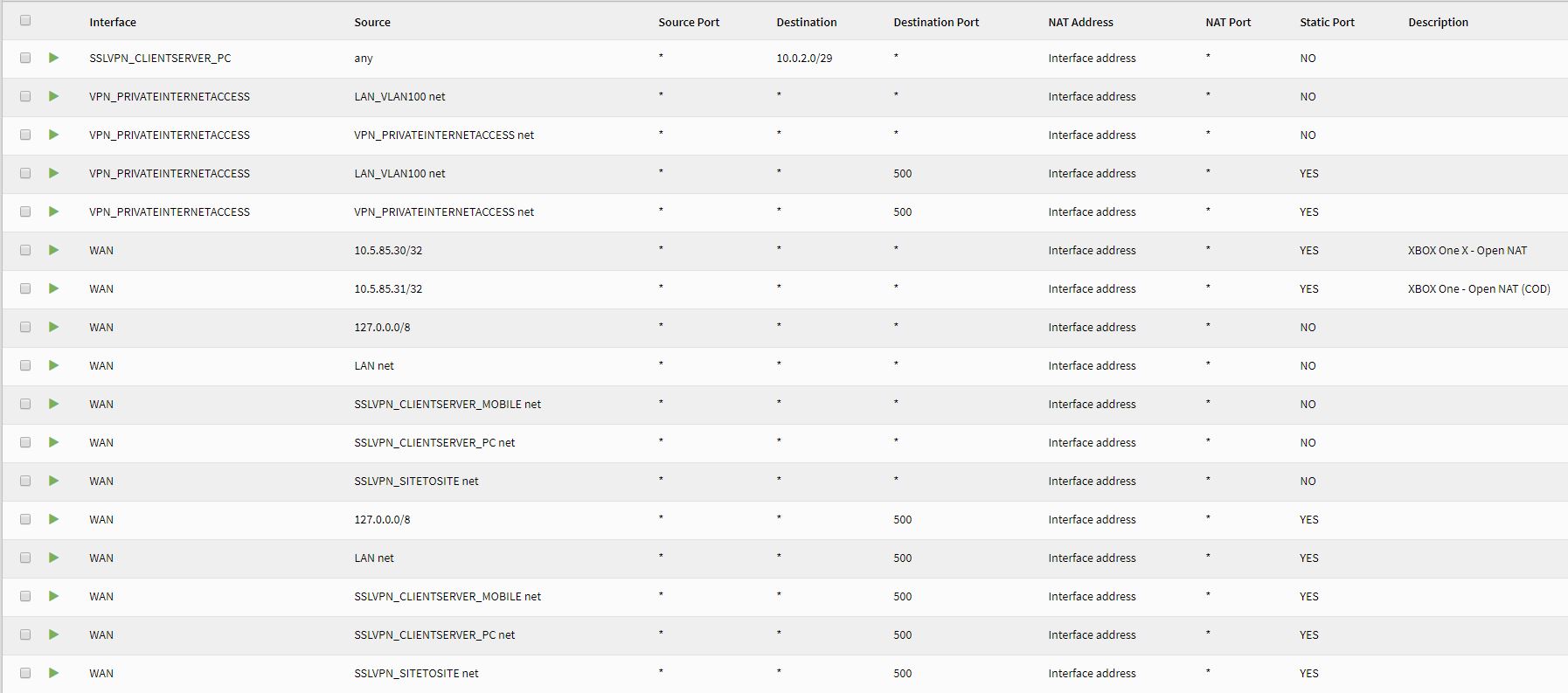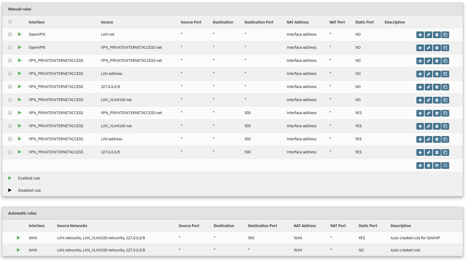 This is what my active/production FW manual outbound NAT rules look like on 18.7.10 I imported this entire config into 19.1.4 and the VPN gateway could not connect anywhere. (WAN Gateway worked perfectly)... Which is why I really think there is a bug somewhere. I have been using this OpenVPN Client setup since I started using OPNSense 2 years ago, all of a sudden it is an issue. My Firewall has: